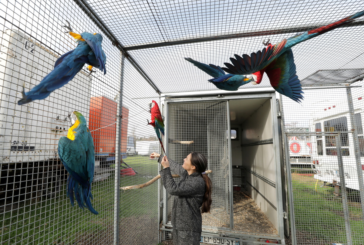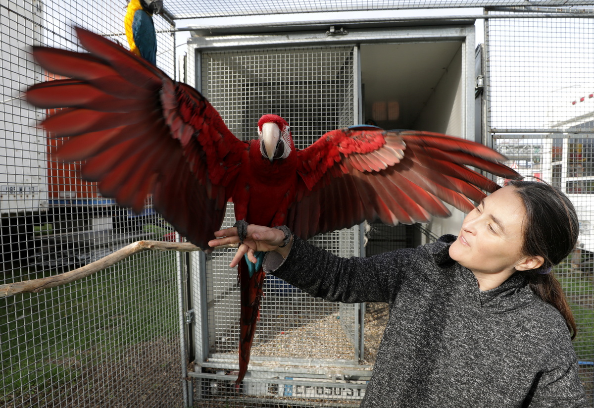 Sophie Kerwich, wife of William Kerwich, owner of the Royal Circus and President of the Circus and Shows Animals Union, poses with her parrots at the circus home base in Senas as circus shows remained shut as part of COVID-19 restrictions measures to fight the coronavirus disease outbreak in France, February 9, 2021. Kerwich also denounced an animal welfare bill which is debated by French lawmakers that would ban using wild animals in traveling circuses and keeping dolphins and whales in captivity in marine parks. Picture taken February 9, 2021. REUTERS/Eric Gaillard