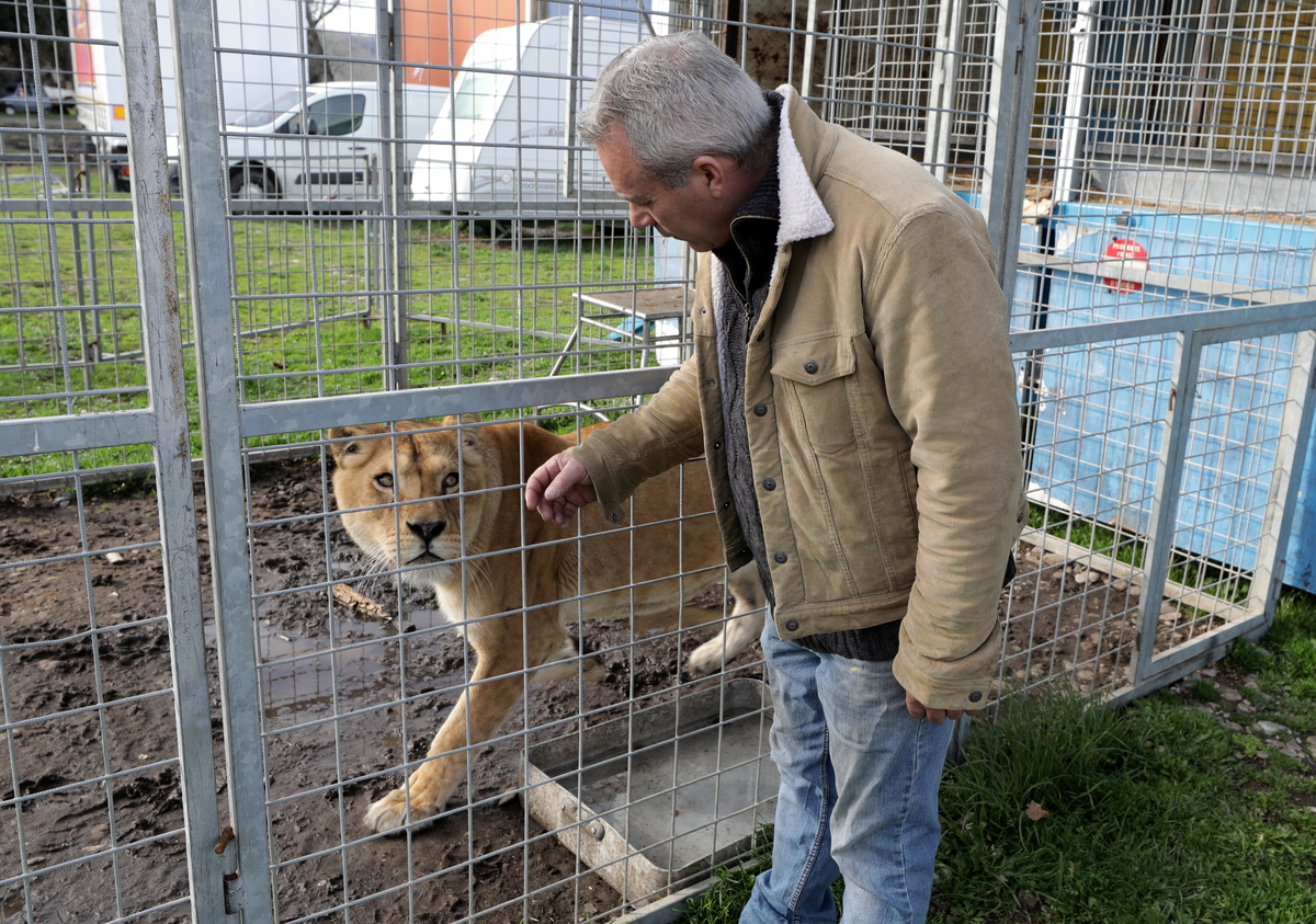 William Kerwich, owner of the Royal Circus and President of the Circus and Shows Animals Union, poses with a lion at the circus home base in Senas as circus shows remained shut as part of COVID-19 restrictions measures to fight the coronavirus disease outbreak in France, February 9, 2021. Kerwich also denounced an animal welfare bill which is debated by French lawmakers that would ban using wild animals in traveling circuses and keeping dolphins and whales in captivity in marine parks. Picture taken February 9, 2021. REUTERS/Eric Gaillard