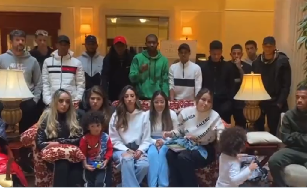 The players were joined by their families, including children, in the video.