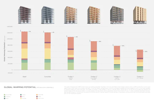 Mass timber is the most transformative technology in architecture right now, but it’s not a silver bullet. Generate’s embodied carbon analysis shows its nearly all-timber design cutting the building’s global warming potential in half, but with more modest reductions for hybrid versions involving steel and concrete. Ho meanwhile points out that while wood may make a structure carbon-neutral or even carbon-negative, there are still all the other materials that go into fitting out a building to consider, like the building facade, insulation, and mechanical systems such as heating and air conditioning.