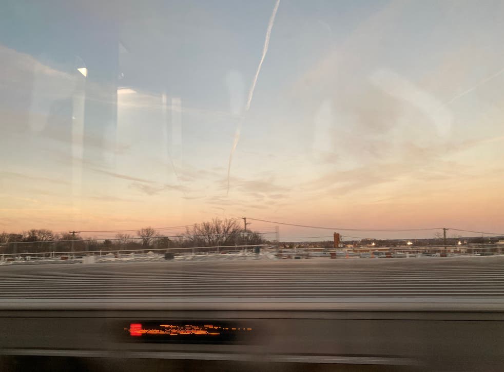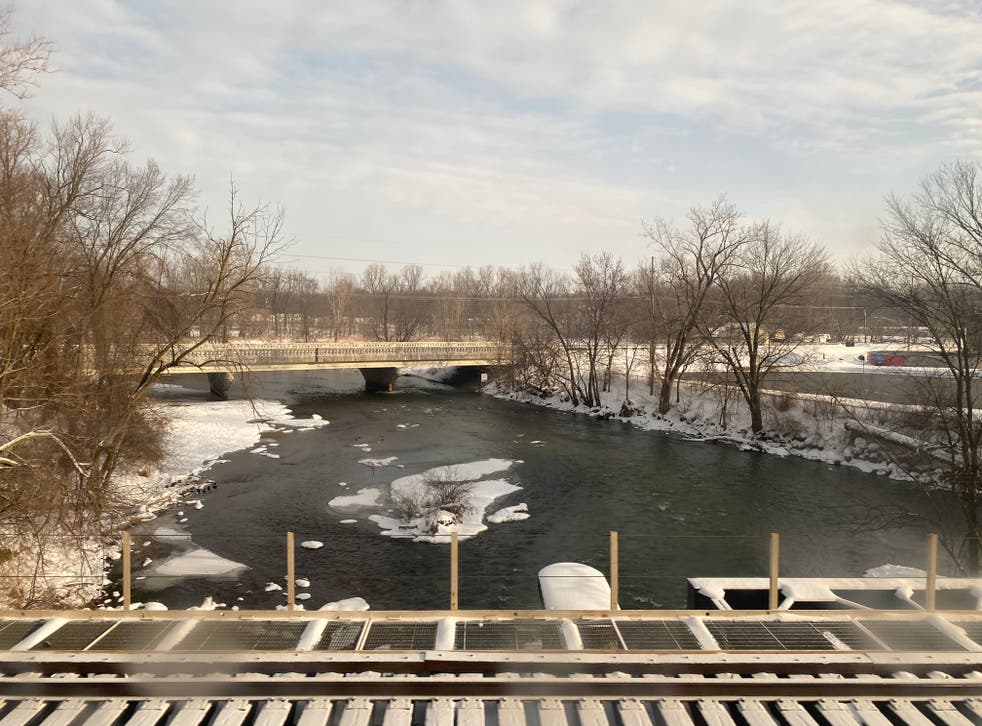 I wake up just outside of Toldeo, Ohio, at around 6am. The sun hasn’t risen yet and I pull back the curtain to see we’re crossing a bridge over the Maumee River, which has frozen over.