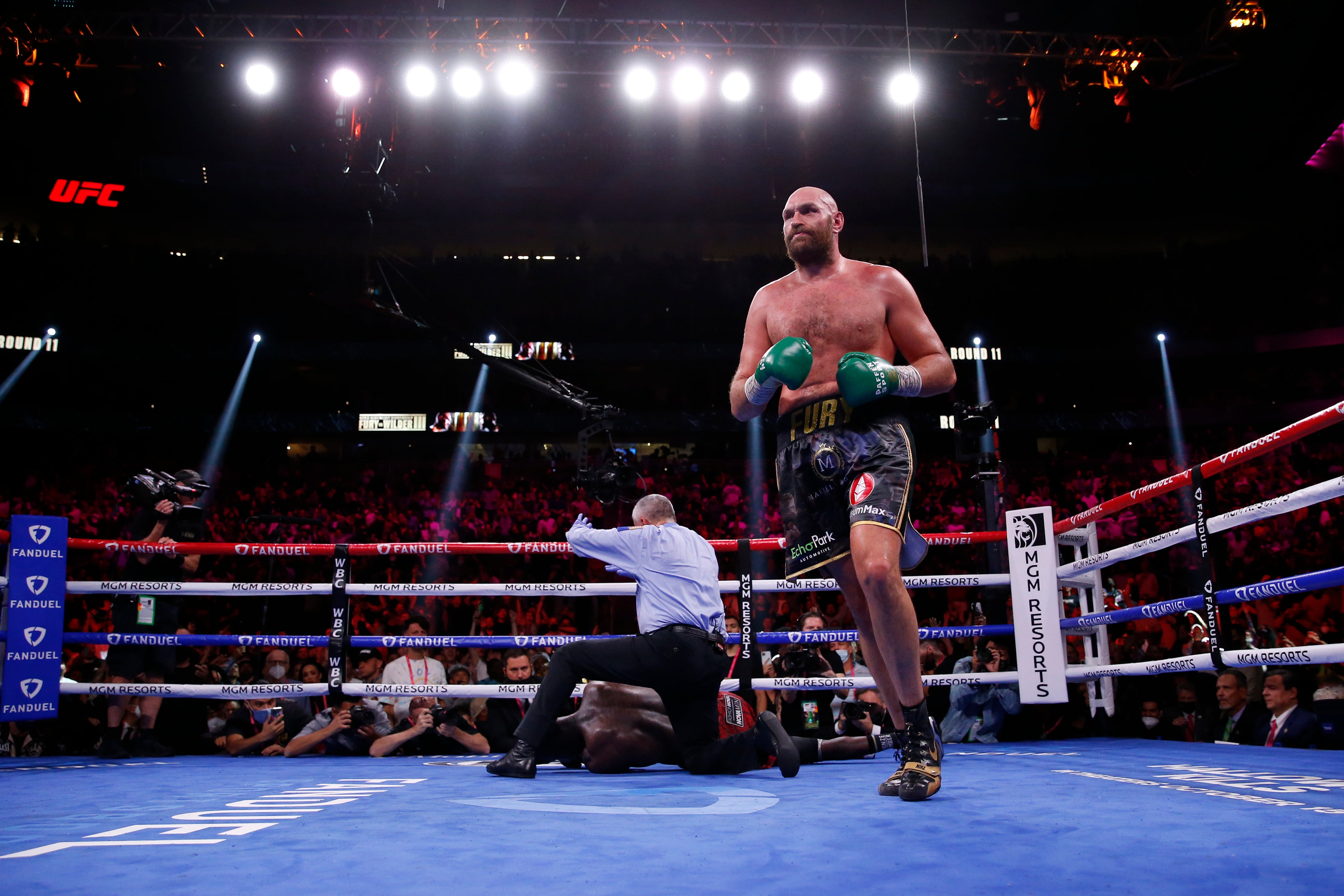 Tyson Fury clambered off the canvas to claim victory in a thrilling third world heavyweight title meeting with Deontay Wilder in Las Vegas.
