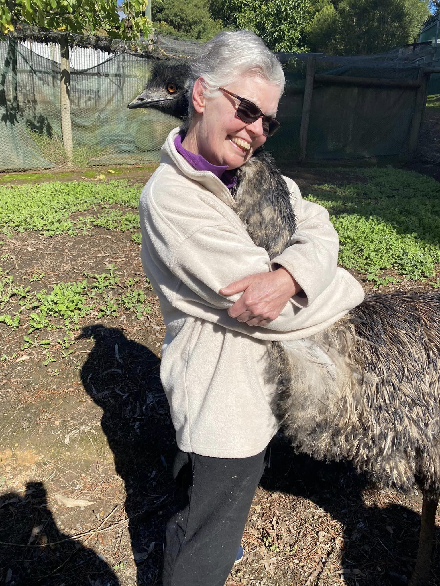 As Bev Langley enters a fenced field at her Adelaide Hills animal rescue, an emu approaches her and receives a hug.