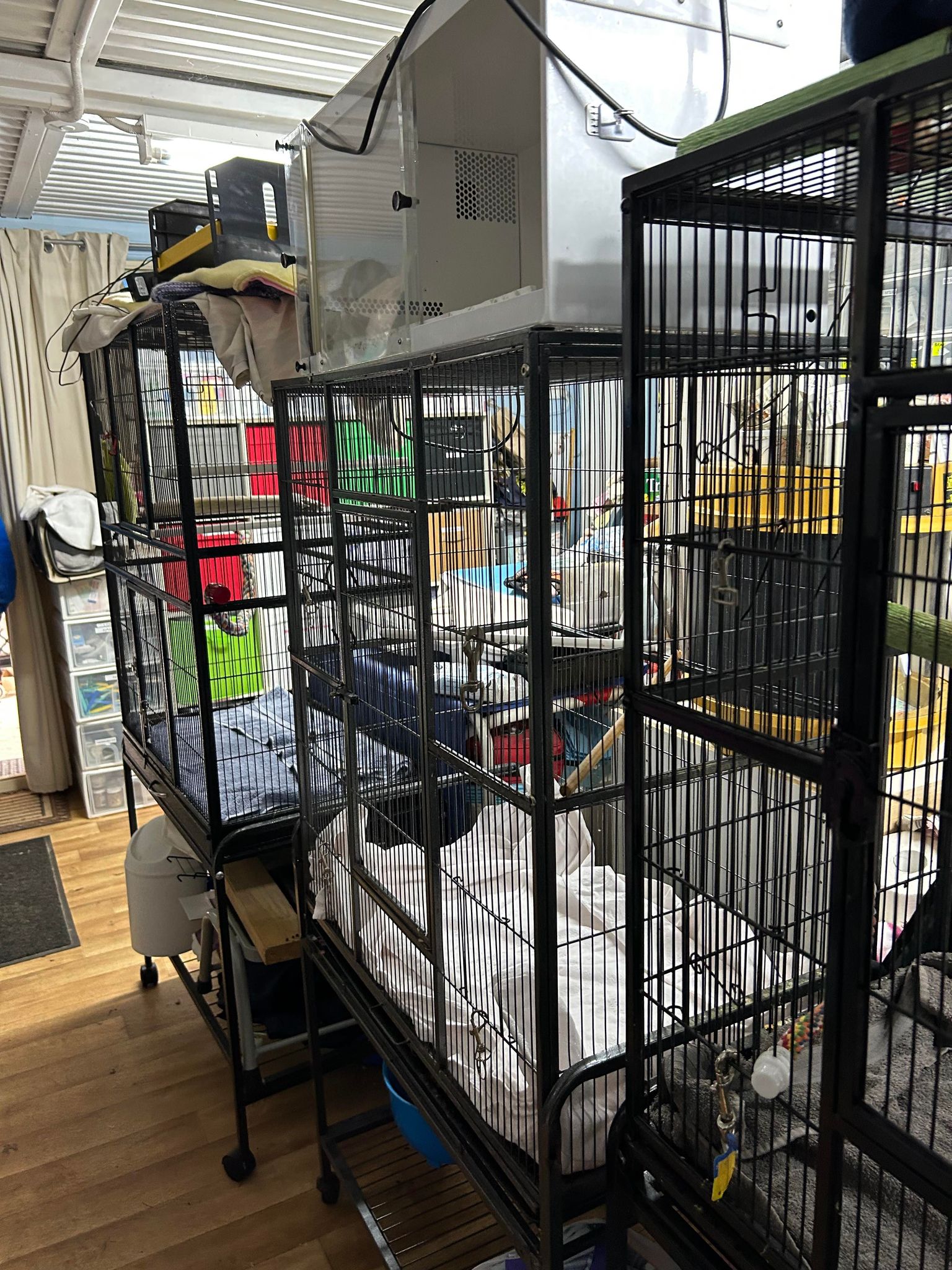 He happily lives in a large standing cage, and is affectionate with Ms Langley, nibbling on her hand and climbing her arm.