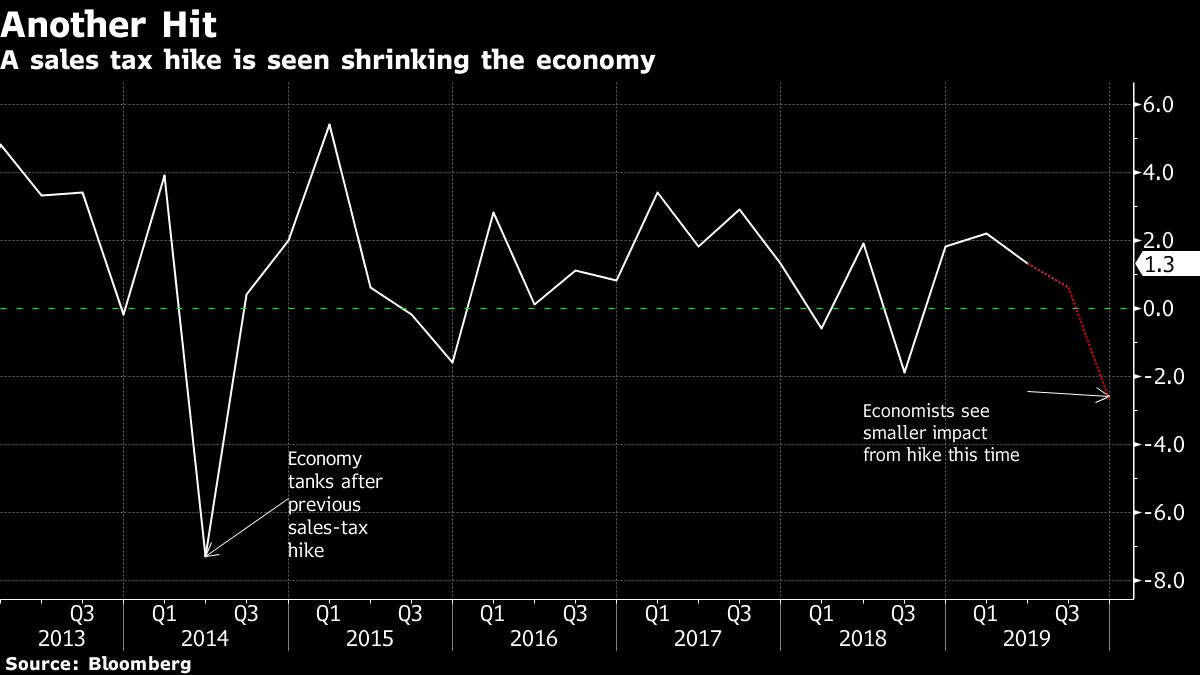 In Bank of Japan Governor Haruhiko Kuroda, a former finance ministry official, Abe has an ally who may also be poised to do his bit to ensure the hit to growth is temporary. In the fourth quarter, economists see the largest contraction since the levy was last raised in 2014, with a rebound to follow in 2020.
