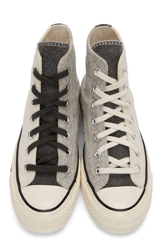 Converse-The perfect "mismatched" pairing comes in the form of these high-top paneled canvas and brushed felt sneakers, colorblocked in off-white and tones of grey. $130