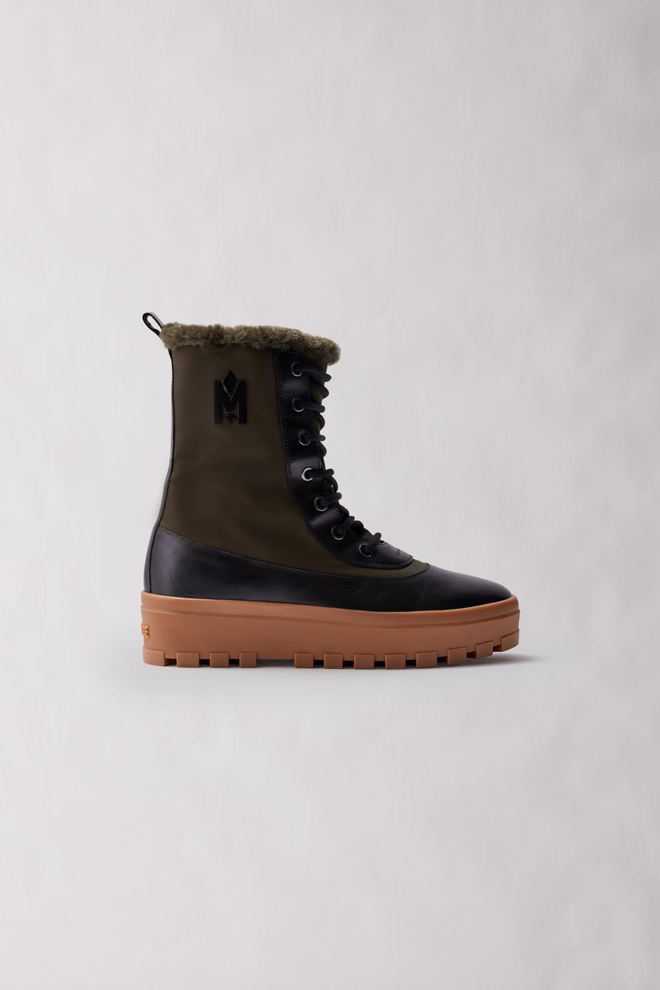 Mackage-Mid-cut lace-up winter boot boasting an ultra plush shearling lining. Meticulously handcrafted in Italy, the tech nylon upper sits atop a raised seam rubber lug sole with an embossed lettermark heel. The tonal mudguard, eyestay, and pull tab backstay showcase smooth grain leather. A signature M patch and outsole print add detail. Fully water resistant, the advanced design is performance tested for Canadian winters. $650