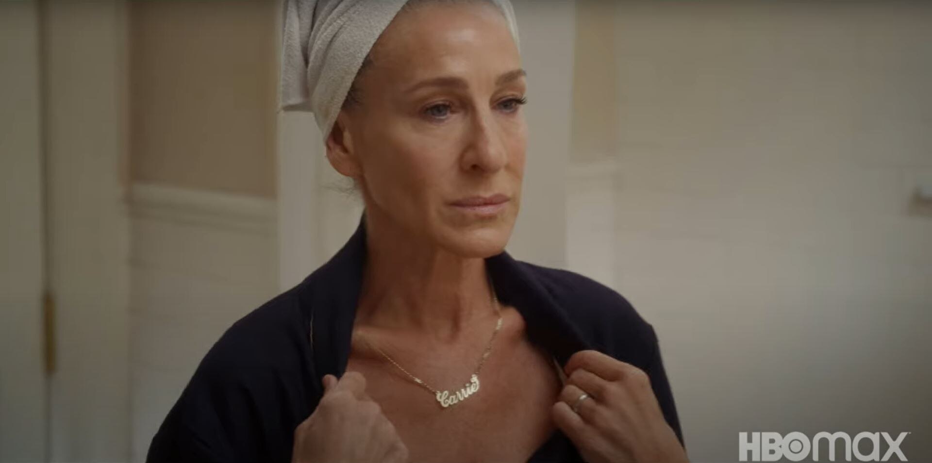 And, look, I don't want to forecast another big break-up, but it looks like that scene is shot in the bathroom of her old apartment, not "heaven on Fifth" (Carrie and Big's apartment).