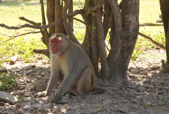 41N sits alone under the waxy leaves of a bay rum tree. When he hears us approaching, he looks up from the ground and smacks his lips as though he has peanut butter on the roof of his mouth. The gray hair on his chest hides his identifying tattoo, but this 16-year-old rhesus macaque is hard to mistake: He has freckles on his face and smears of red extending horizontally from his eyes like war paint. Because March is the breeding season here on Cayo Santiago — Puerto Rico’s so-called ‘Monkey Island’ — his face and genitals are tinted a garish coral hue.