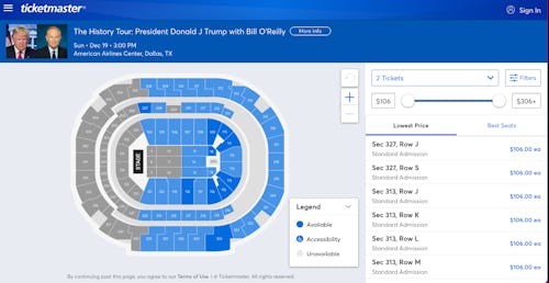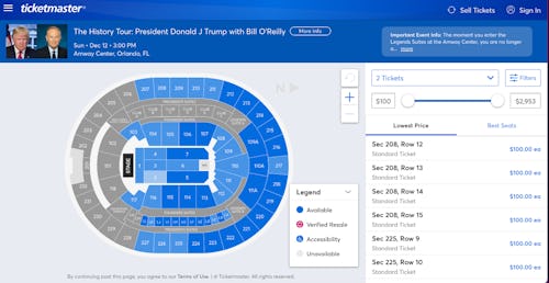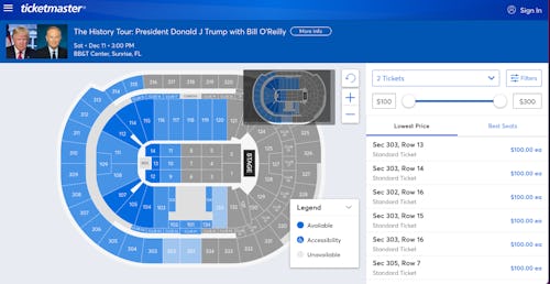 "There's still a lot of tickets open," a representative for Orlando's 20,000 person Amway Center told Politico on Friday. "We have concerts that are doing a lot better than this." A glance at the Ticketmaster page for the tour's first stop in Sunrise, Florida, shows huge portions of BB&T Center seating is still available for the Dec. 13 event.