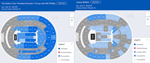While it's true that the tour's four stops are still months away and sales could, indeed, pick up as we draw closer to the event, consider this side-by-side comparison of the Trump program's seating at the Amway Center, and a Jimmy Buffet concert scheduled for the night before.