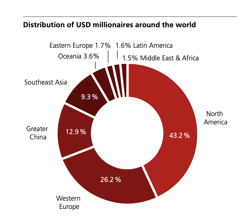 - Distribution: North America is home to 43.2% of the world’s millionaires, followed by Western Europe (26.2%), Greater China (12.9%), and Southeast Asia (9.3%).