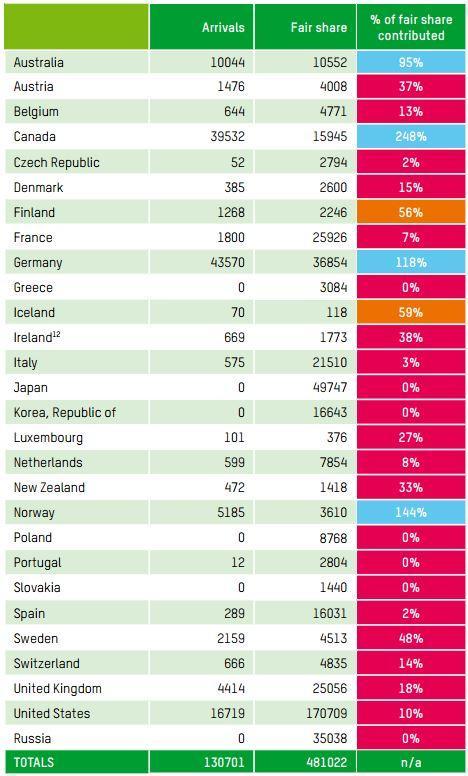 Of the 28 countries which the report considers as wealthy, seven have resettled no Syrian refugees at all – including Russia, Japan, South Korea, Portugal, Slovakia, Poland and Greece – although hundreds of thousands of refugees are currently in Greek holding camps.