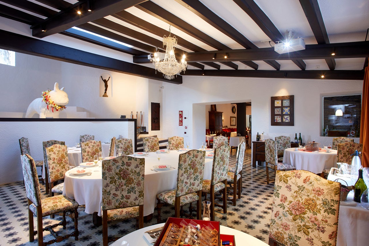 Set inside an 18th-century building with a spacious courtyard, one of the most distinctive dishes here is the anchovies and almond “mato” cheese. On first hearing the description, it sounded like a questionable combination. The mato cheese, a flat square block like feta, is made with almonds and replaces a more traditional Catalonian cheese, which is similar to ricotta. It’s adorned with little drops of truffle oil; a dark honey is drizzled diagonally over it, and it’s topped with pine nuts.