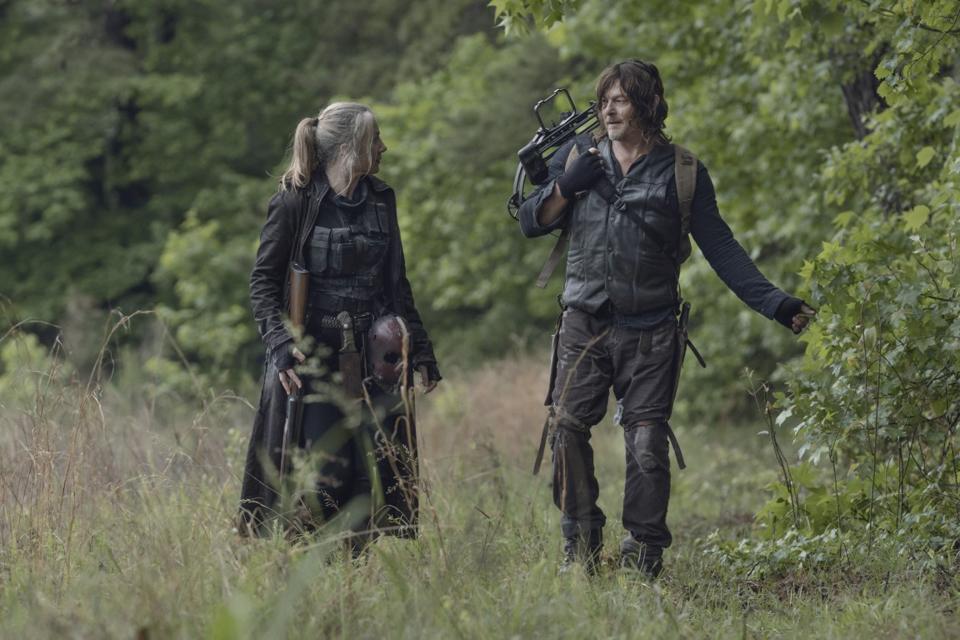 The third, and shortest, of the storylines centers around Daryl and Leah who are out scouting trying to find the “dozens-strong” group that Daryl told Pope he was traveling with. So far, none of the Reaper scouts have found them. Since they don’t exist.