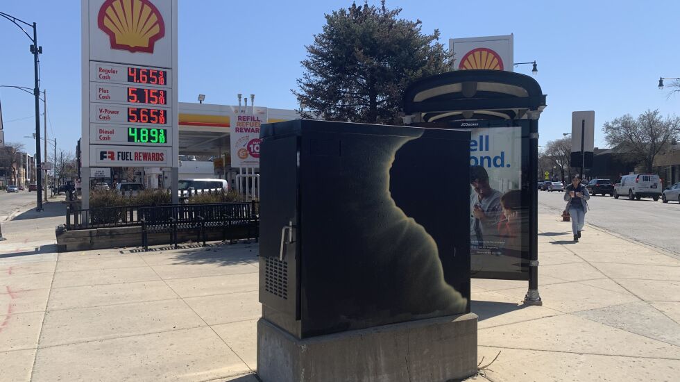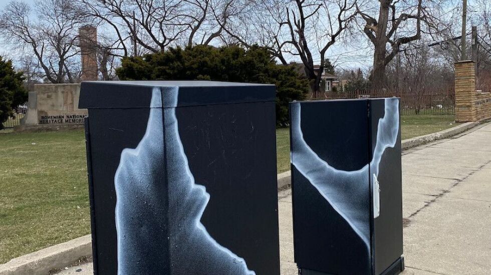 One of Joos’ recent and relatively subtle creations is what he calls a “bubble box” — a hazy, snaking marking he spray-paints with a flourish on street-corner utility boxes including some on Milwaukee Avenue, a favored target.
