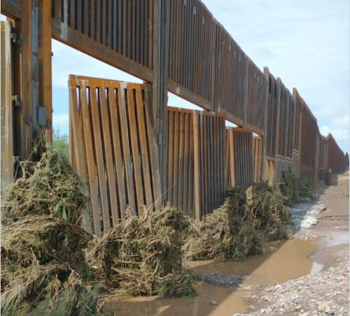 José Manuel Pérez Cantú, the director of the nonprofit Cuenca de Los Ojos, told Earther that at least six gates on the fence near San Bernardino Ranch, located between Douglas, Arizona, and the San Bernardino Wildlife Refuge, which sits right on the U.S.-Mexico border, were felled by rain. According to a report from the Tucson Sentinel, more gates throughout Southern Arizona got knocked off their hinges and pushed open by flood water and mud. The rushing waters have also left debris littered throughout the parts of the wall that have remained standing.