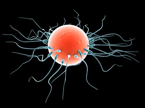 The mathematics of how the sperm flagellum moves is very complex. The flagellum uses molecular scale “motors” to effectively shape-shift. They use energy in one form and convert it into mechanical work, generating motion. These motors power tiny fibres that exist in a bundle called an axoneme. These are beautiful, geometric and slender structures that can be up to 0.05 millimetres long in human sperm – about half the width of a human hair.