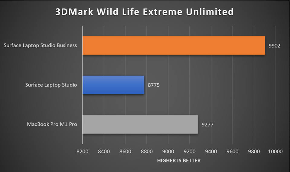The MacBook Pro score is about 500 points higher than the Surface Laptop Studio and about 700 points lower than the Surface Laptop Studio Business. According to the way the Wild Life Extreme score is calculated, it is based on an average FPS of the graphical rendering with a multiplier of 167. This scoring makes it easy to find the FPS of the mobile gaming test, which I believe will give us a better idea of that 500 and 700 points difference. The MacBook Pro ran on average at 55.6 FPS, the Surface Laptop Studio with a 3050 Ti ran at 52.5 FPS, and the Surface Laptop Studio Business ran at 59.3 FPS. In most cases, a 3 to 4 FPS difference in gaming goes unnoticed and makes no difference in the performance of a game. The MacBook Pro undeniably has the greater performance against the Surface Laptop Studio with a 3050 Ti, but it is minimal, and I believe it comes from the M1 Pro’s mobile background.