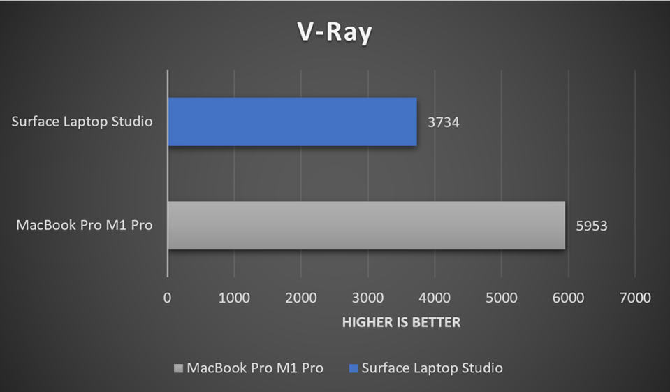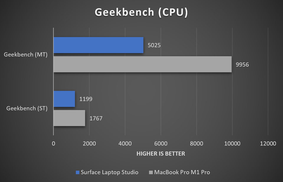 The Intel Core i7-11370H is fairly underwhelming compared to the MacBook Pro M1 Pro. The MacBook Pro outperforms the Surface Laptop Studio by a percentage difference of about 46%. In scenarios where content creators are almost exclusively using the CPU for rendering, the MacBook Pro M1 Pro is a clear winner.