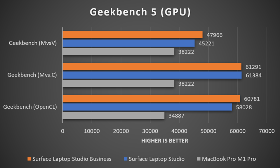 The MacBook Pro M1 Pro outperforms the Surface Laptop Studio in both ST and MT performances by about 38% and 65%. I believe this has to do with the M1 Pro’s advantage of better IPC and having 8 single-threaded cores and the Core i7-11370H having 4 multi-threaded cores. These scores reveal the Surface Laptop Studio’s biggest weakness, its CPU. While I am not saying the Intel Core i7-11370H is a bad processor, the M1 Pro with 8 single-threaded cores has a much better value. The Intel Core i7-11370H is definitely up for the task and what it has going for it that keeps it in the fight is the support for x86 programs.