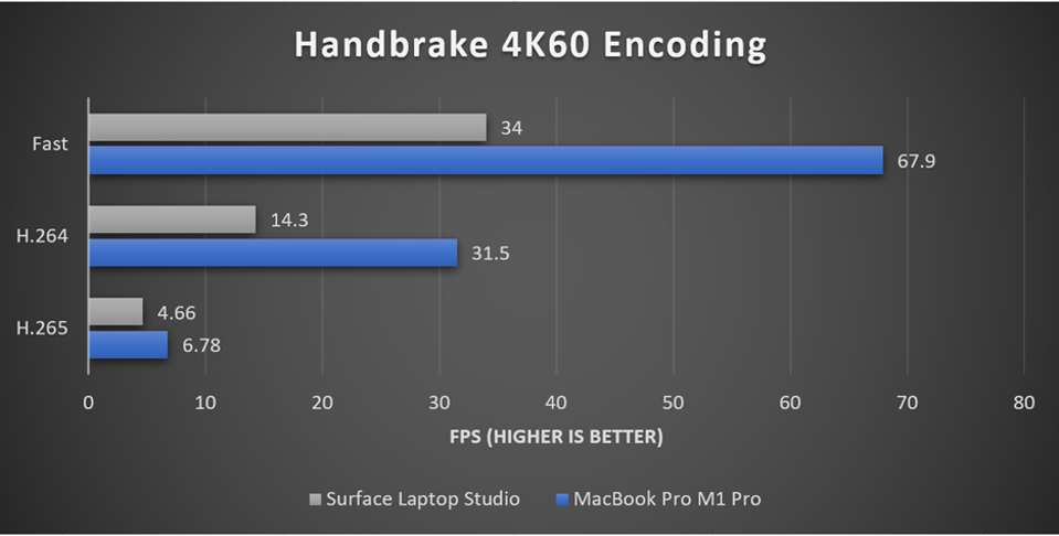 The MacBook Pro M1 Pro laps the Surface Laptop Studio in video encoding on all three levels of encoding. To put into perspective how much faster the MacBook Pro is, it took me 1 hour 33 minutes and 39 seconds on the MacBook Pro to encode Big Buck Bunny using the H.265 preset, and it took the Surface Laptop Studio 2 hours 16 minutes and 9 seconds to encode Big Buck Bunny using the H.265 preset.