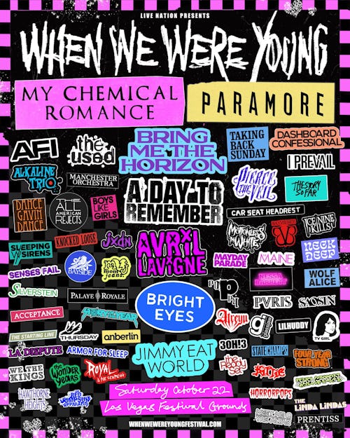 Your emo phase is set to return for one night only. The When We Were Young Festival, a one-day rock gathering that first debuted in 2017, announced an absurd 2022 lineup, featuring just about every single emo and pop punk band you ever loved.