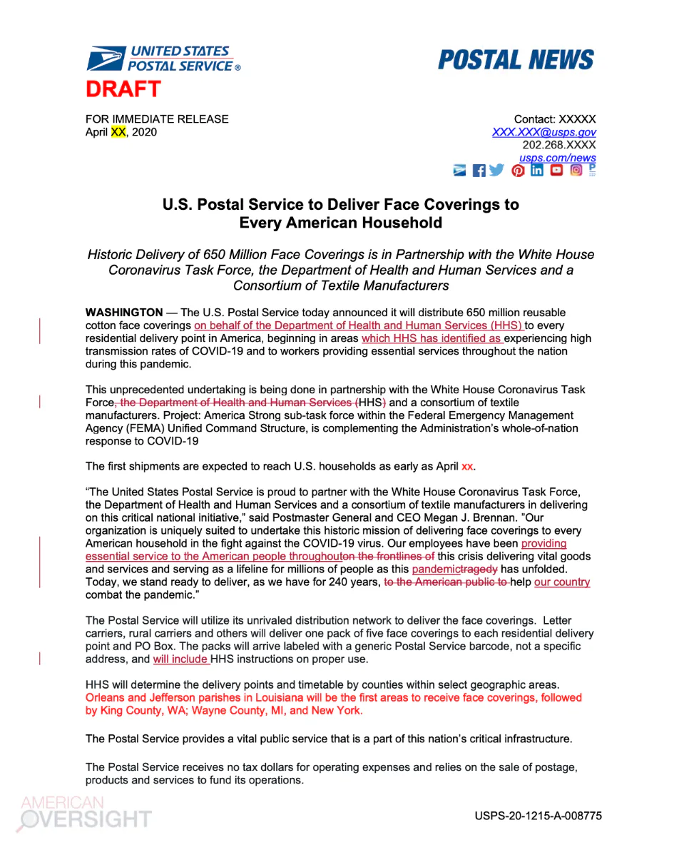 There was even a draft press release created to announce the massive — and possibly massively life-saving — distribution plan, complete with rousingly patriotic quotes from then-Postmaster General Megan Brennan.