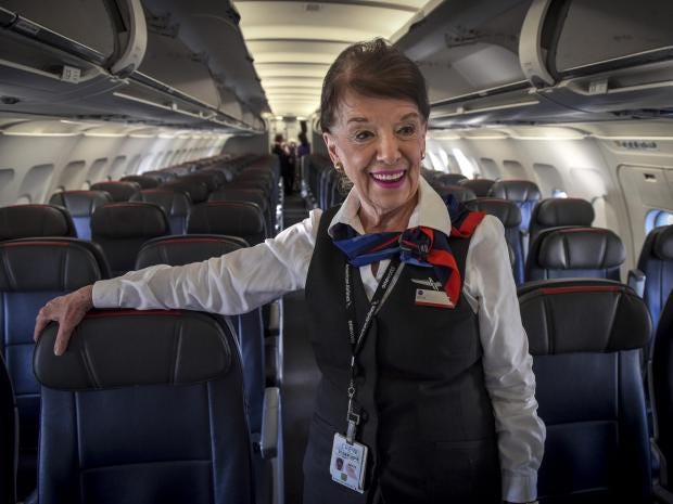 The mandatory retirement age for pilots in the industry is 65, but there is no such thing for flight attendants, so Nash is still flying.