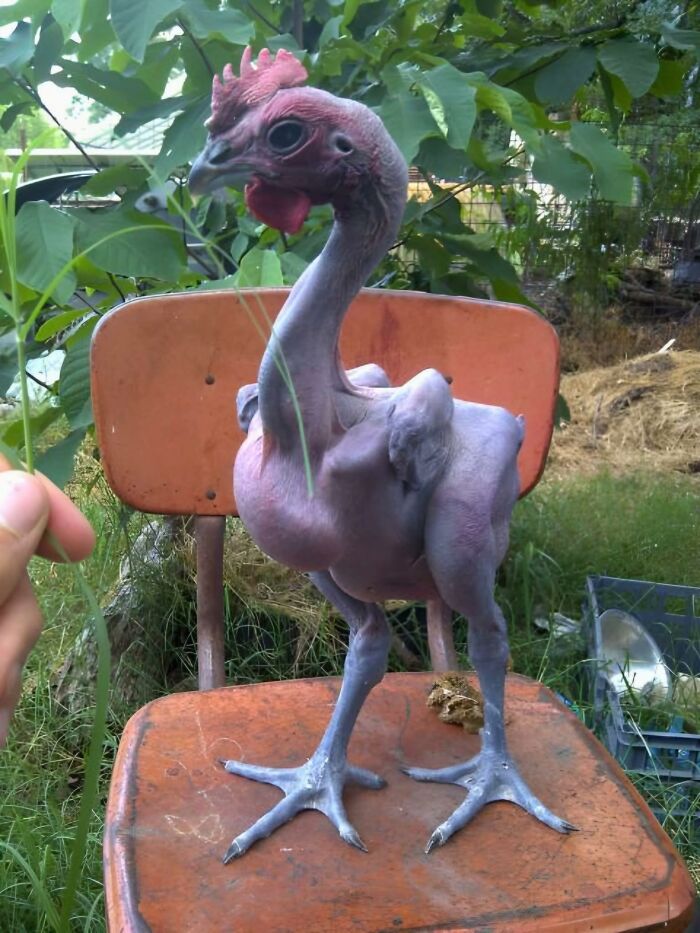 This is a real photo of a live rooster with a skin condition that has caused him to lose all of his feathers