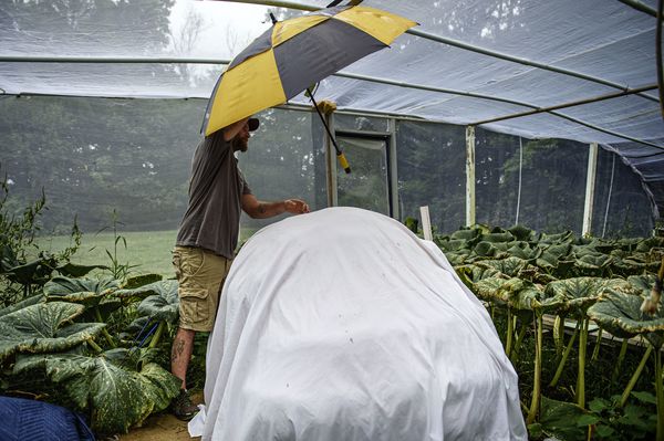 ???At the end of a dirt road in Higganum, there are three giant pumpkins growing in a netted hoop house behind Ryan and Chelsea Cleveland's house. Each fruit is surrounded by dozens of two-foot tall leaves, each looking like an upturned child-sized umbrella. Wooden planks indicate the narrow path where foot travel is allowed because any damage to the vines and roots transporting up to 100-gallons of water a day can mean precious pounds lost.