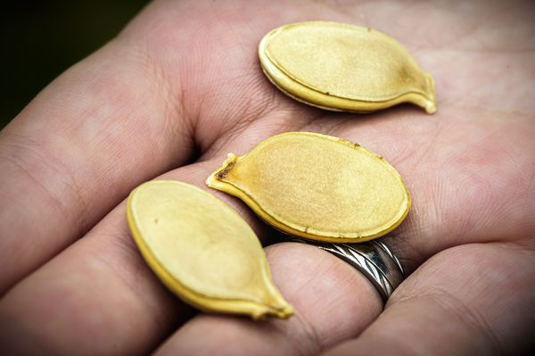 Vincent's last remaining 2020 pumpkin now rests on a bed of sand, where he will take an axe to its thick walls, hoping to harvest seeds for next year.