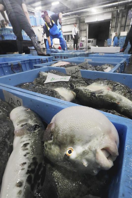 Large torafugu pufferfish are piled in plastic cases in Monday's early hours for this year's first auction of the poisonous delicacy at a lively fish market in Shimonoseki, Yamaguchi Prefecture. The city boasts of being one of the largest sources of torafugu in the country. For the auction, 160 kilograms of natural torafugu arrived at the market, 30 kilograms more than last season. The top fish fetched 25,000 yen per kilogram, 6,000 yen higher than last season. In addition to natural pufferfish caught off Hagi in the prefecture and other places, three tons of cultured pufferfish were also auctioned.