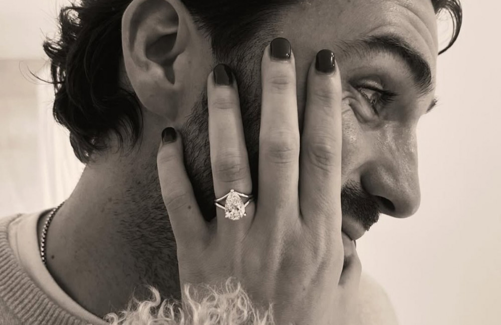 In an Instagram post by the pair shared on both their accounts, Carly showed off the pearl-cut diamond ring that sat on a split gold band as she rested her hand on the 32-year-old actor's right cheek.