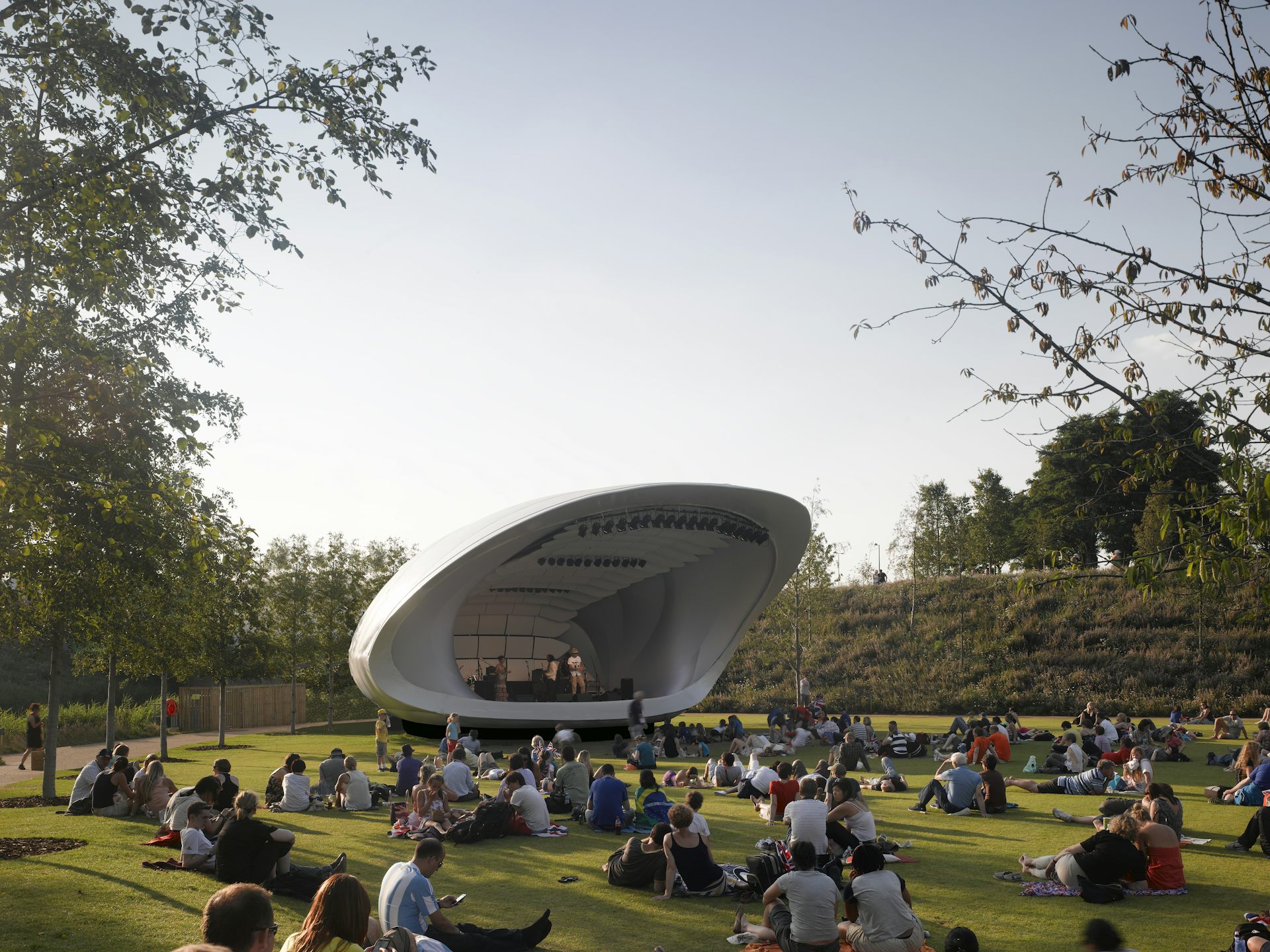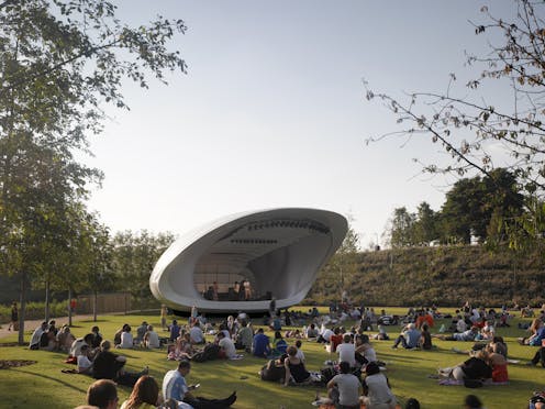 The visually striking mobile concert platform Soundforms (from the UK) brings the acoustic qualities of an indoor concert hall to outdoor public spaces. Soundforms is shaped like a large white shell lined with rows of acoustic panels. It differs from other outdoor concert platforms – like California’s iconic Hollywood Bowl – because it can be moved to different places and musicians don’t need to rely on electric amplification to be heard clearly.