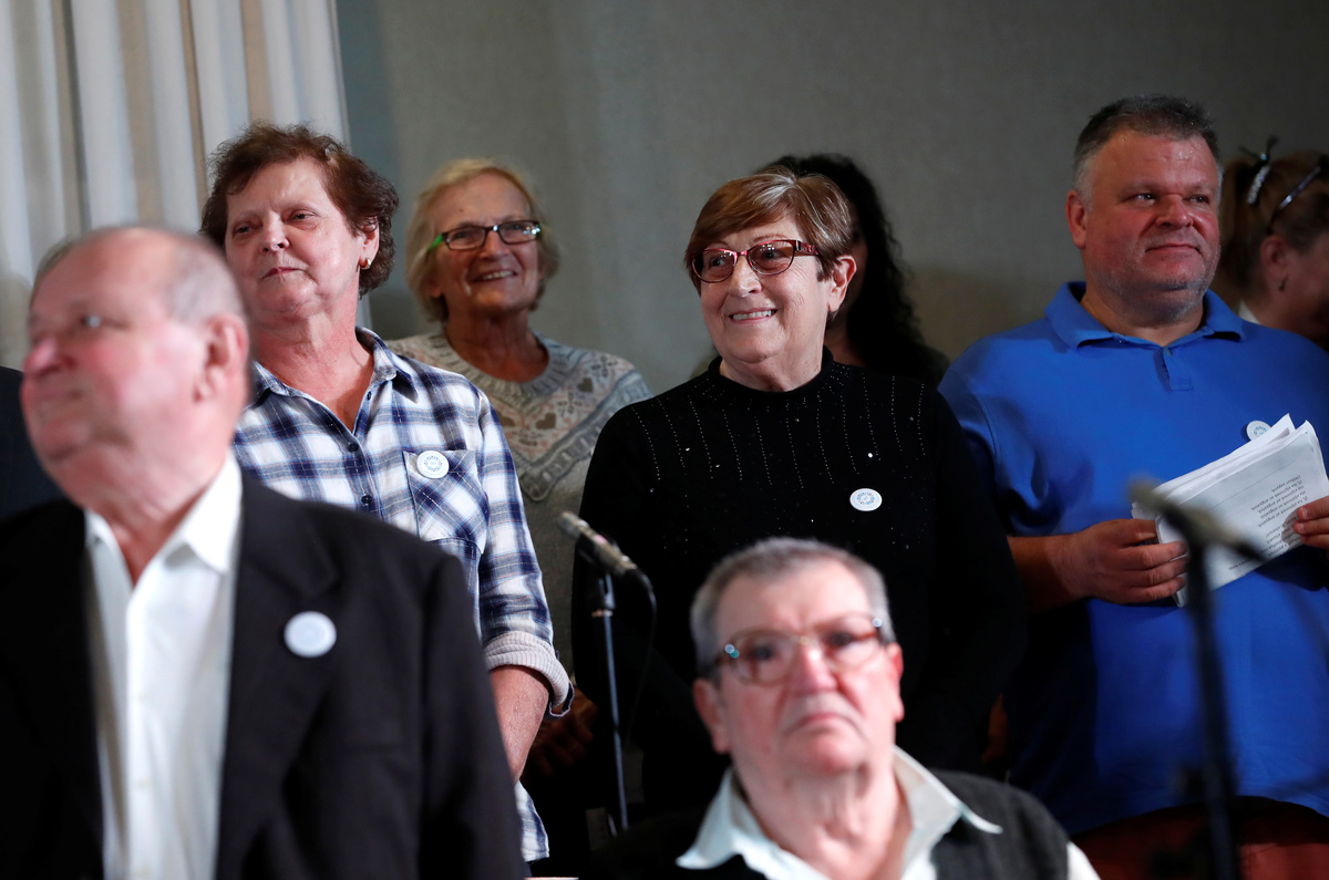 Members of the "Breathing for the Soul" choir, who are patients suffering from lung diseases, react during their concert in Budapest, Hungary, November 15, 2018. REUTERS/Bernadett Szabo