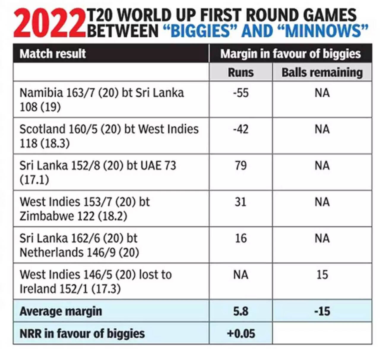 There were six games involving one of the big teams (Bangladesh and Sri Lanka in 2021 and West Indies and Sri Lanka this time) against one of the others in the group 1 stage in both 2021 and 2022. If we treat the two big teams as one entity and the rest as the other entity, the net run rate between the two was +2. 75 for the biggies.