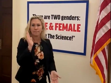 A few hours later, Ms Taylor Greene put up the sign saying: "There are TWO genders. MALE & FEMALE. Trust the science!"