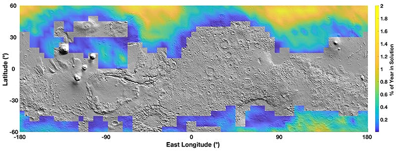 The study found that brines could cover up to 40% of the Martian surface. However, the water would flow on Mars seasonally, for only about 2% of the Martian year, which is the equivalent of 687 Earth days, while Mars' subsurface could hold brines for about 10% of the Martian year.