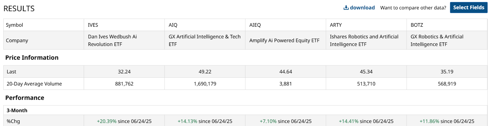 I’m familiar with the AI ETF space, and came up with a quick 5-some including IVES. I wanted to see if there was some “alpha,” even over the short time frame that matches IVES’ existence.