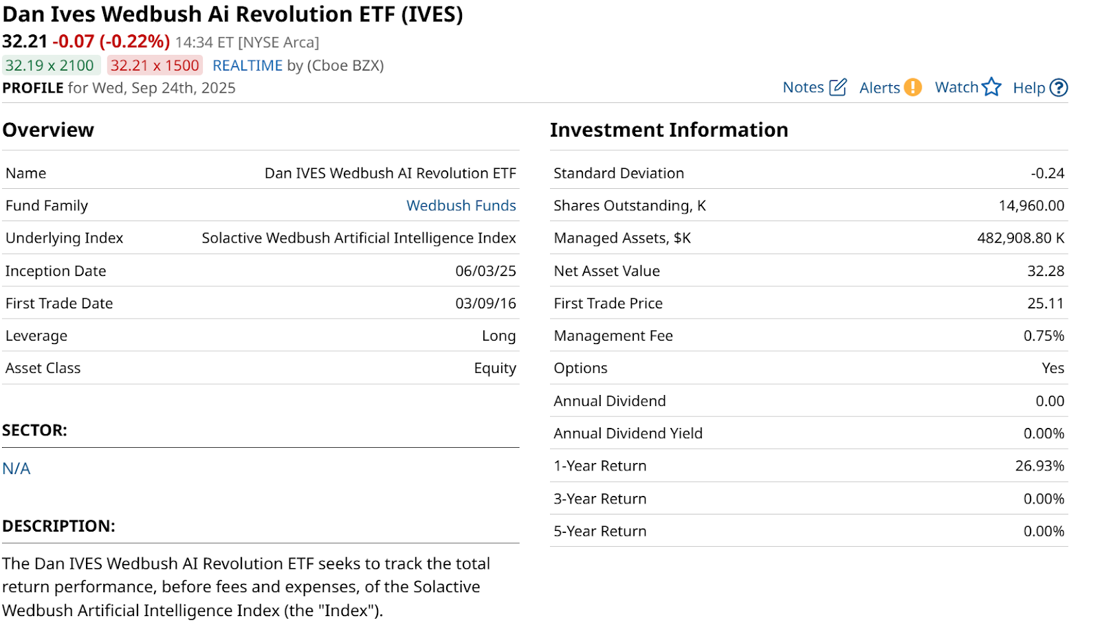 And so it is with the Dan Ives Wedbush AI Revolution ETF (IVES). The fund launched in early June and appears to have had about $60 million in initial assets in place for launch.