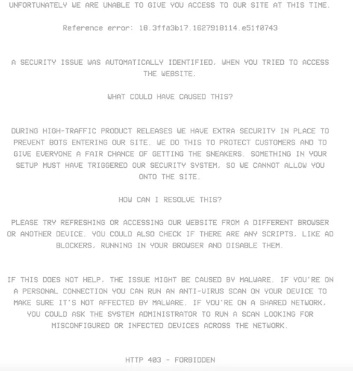 “Extra security” is in place to prevent people from using bots, but the error could also be triggered by ad blockers or malware, according to the error page. It’s also possible that whatever measures Yeezy Supply is using are also overzealous and flawed, as I’ve been unable to access the website despite my computer having none of those aforementioned issues.