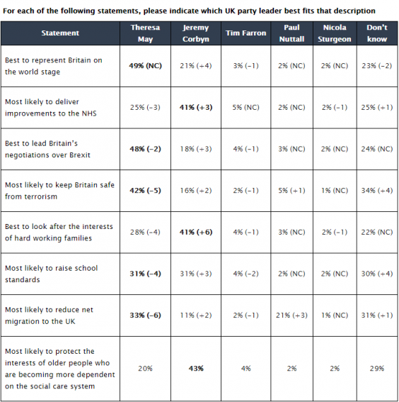 The Prime Minister’s ratings have fallen on everything except being “best to represent Britain on the world stage”, unchanged on 49 per cent, while Mr Corbyn’s ratings have risen since two weeks ago on all statements tested, including representing Britain, on 21 per cent, up four. Mr Corbyn now holds a 13-point lead, up 10 points, over Ms May on being “best to look after the interests of hard-working families”, and has drawn level on “most likely to raise school standards”.