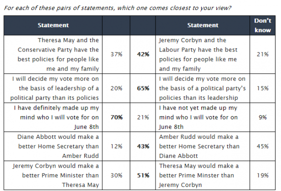 In a straight choice (below) Mr Corbyn and Labour are seen by 42 per cent to have “the best policies for people like me and my family”, just five points ahead of Ms May and the Conservatives on 37 per cent.