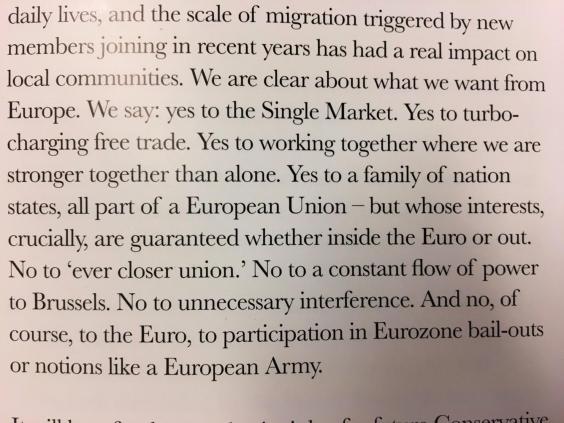 Later, it states: “We benefit from the Single Market and do not want to stand in the way of the Eurozone resolving its difficulties….we will not let the integration of the Eurozone jeopardise the integrity of the Single Market or in any way disadvantage the UK.”