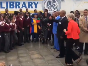 In the footage, which was shared widely on social media, Ms May is seen copying a routine being performed by the group opposite her, raising her hands to the sky.