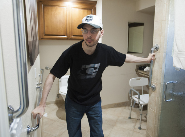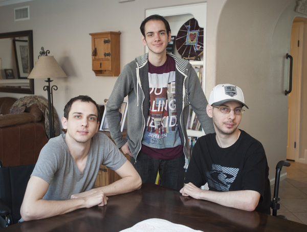 Peter and J.T. De Mint can get around at home holding on to furniture, but they use wheelchairs when they leave the house. Peter De Mint goes to the gym with a friend twice a week, and J.T. De Mint works out at home. Tim De Mint works out twice a week at the Goodwill Fitness Center in Santa Ana, Calif., to maintain his core strength.