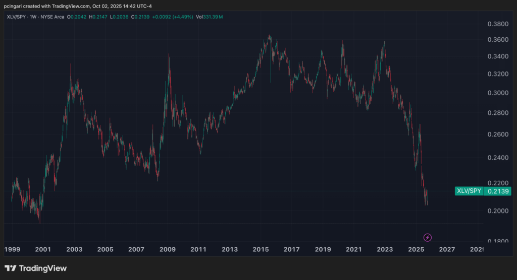 The XLV/SPDR S&P 500 ETF Trust (NYSE:SPY) ratio dropped to 0.2050 in late September — the lowest since December 2000.