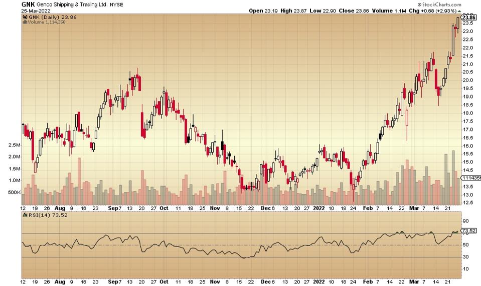 Joining the other shipping stocks that are benefitting from supply chain issues and other global trade problems, this one just hit 23.06, up from that late January low down near 12.50. Nice move.