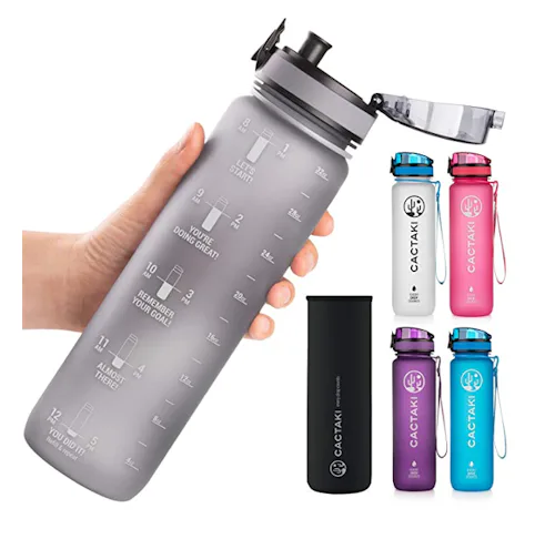 Keep this 32-ounce water bottle close by to stay hydrated all day. It's made from BPA-free plastic and features a leak-proof lid that you can open with one hand. The best part about this bottle, though, is the motivational markers etched onto the side. These markers tell you what time to drink water while letting you know that you're doing great.
